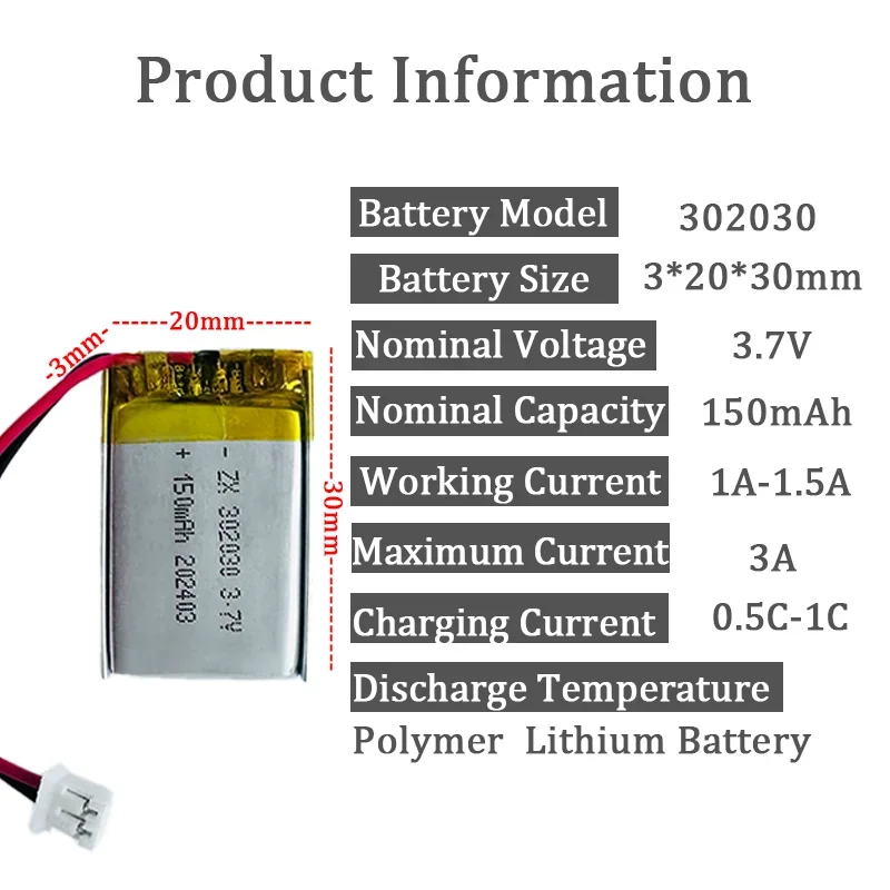 302030 150mAh Li-Po Battery Lithium with Jst PH 2.0mm 2pin Plug for GPS MP3 MP4 Driving Recorder JP(Origin)