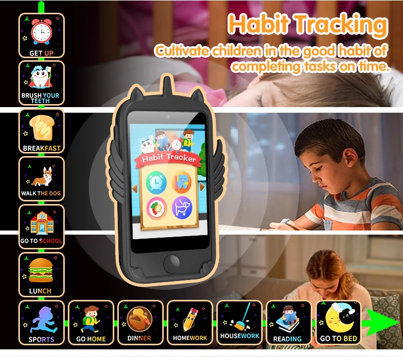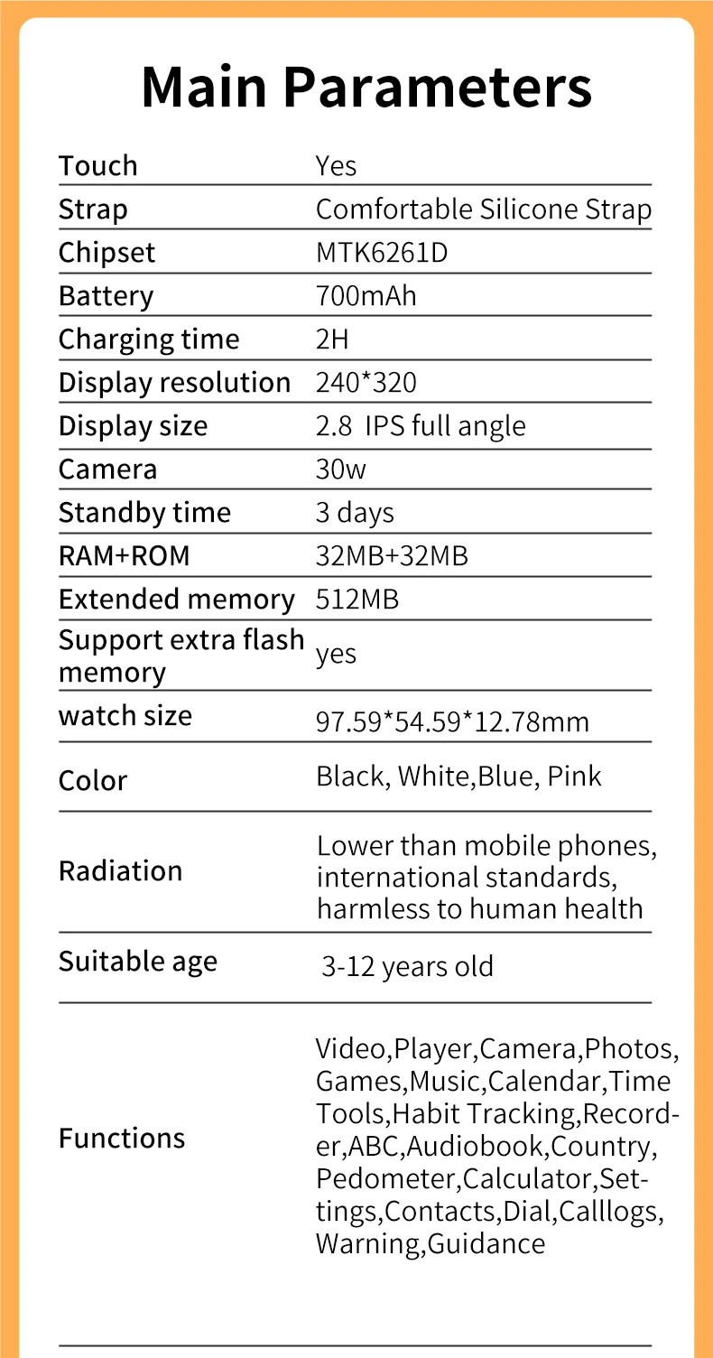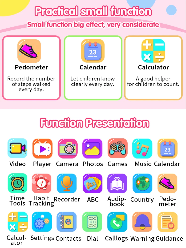 Function introduction (call version with contacts, dial, and call records) Camera, photo album, video recording, video playback, music playback, recording, time tool, calculator, calendar, step counting, habit tracking, animal word learning, national building learning, storytelling, background switching, 19 games.